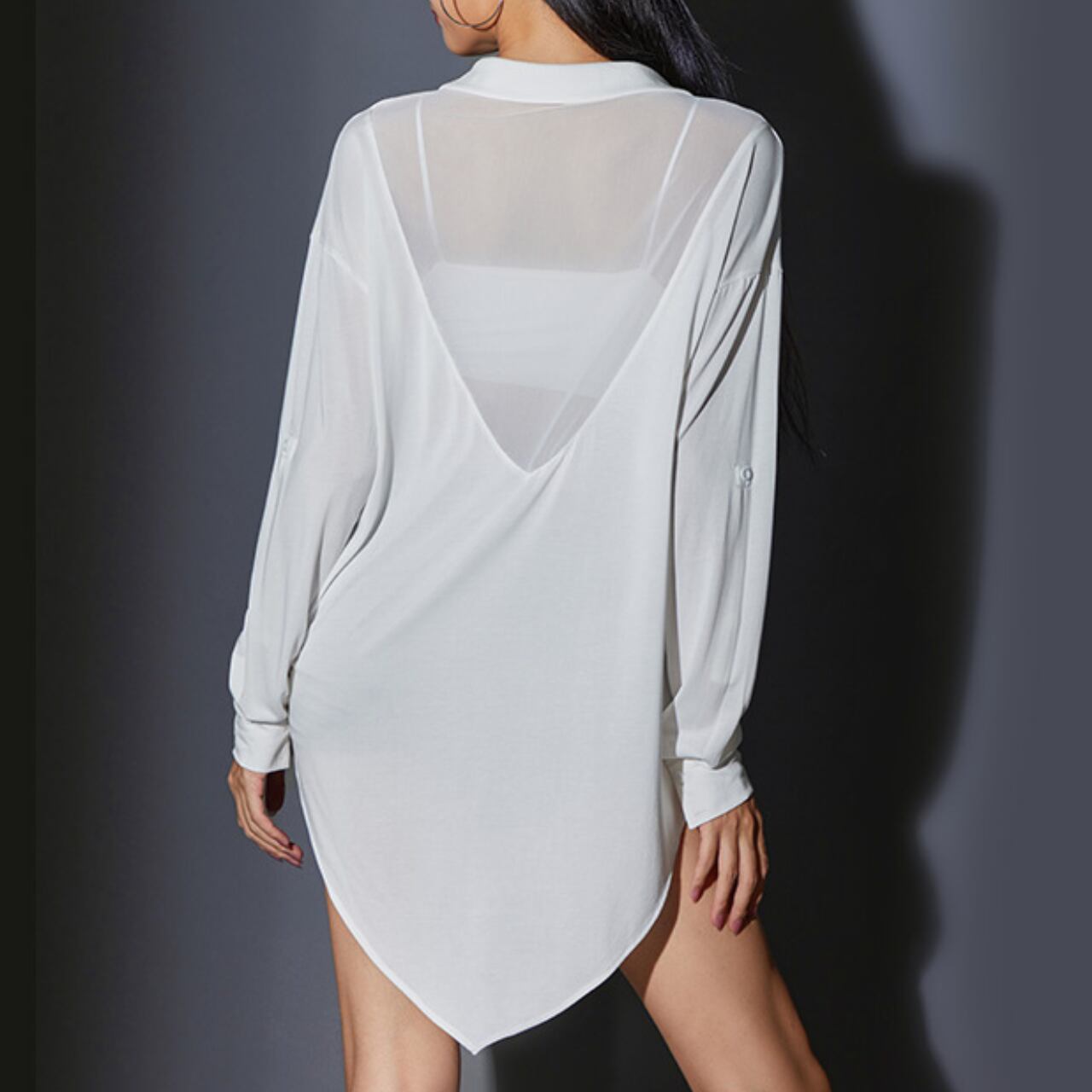 背中は深めのV字メッシュでシースルーになっている点や
