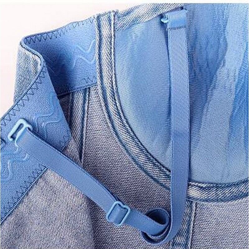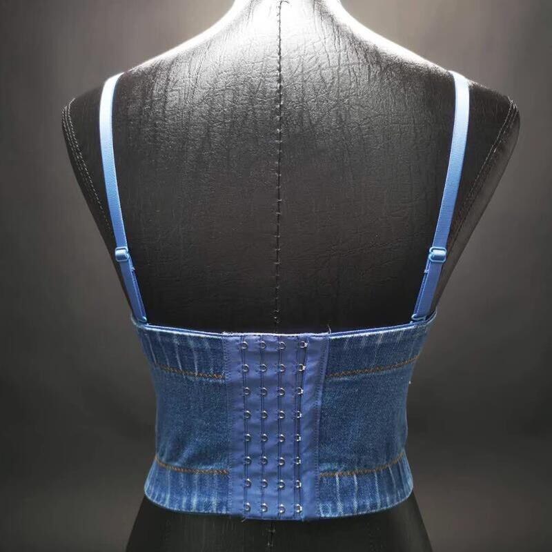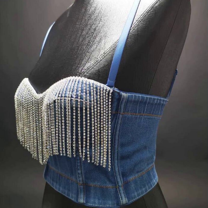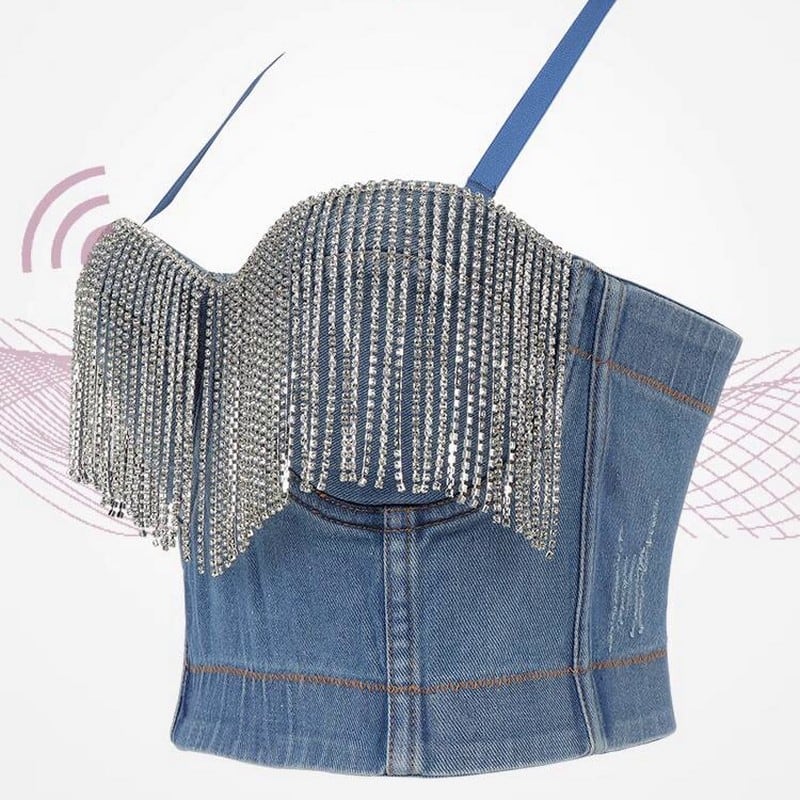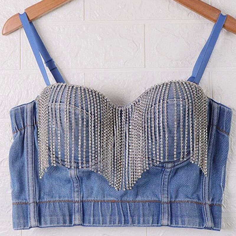胸元を飾るビジューが輝く、デニム素材のブラトップです。