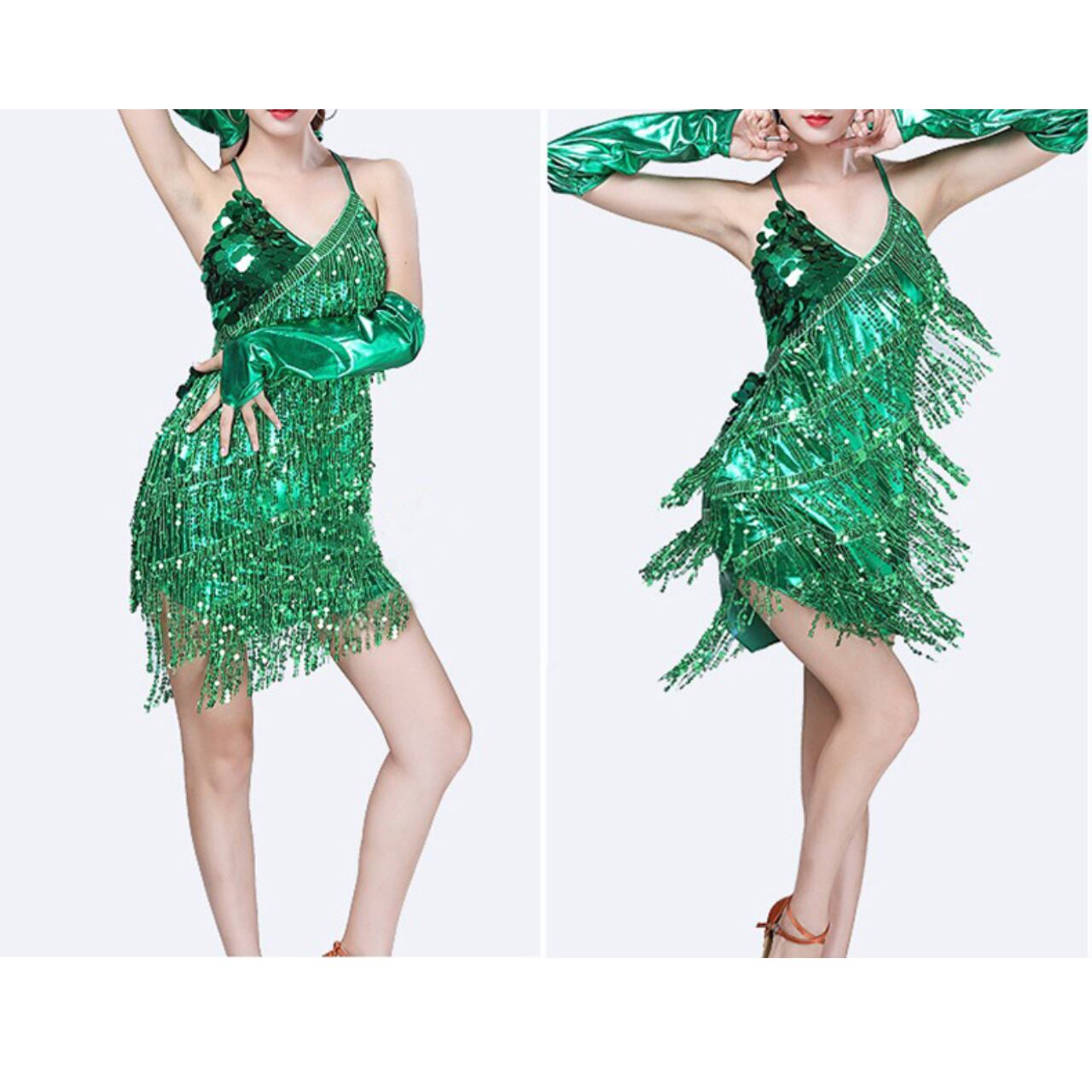 華やかなスパンコールとフリンジが魅力的なミニキャミソールドレス。