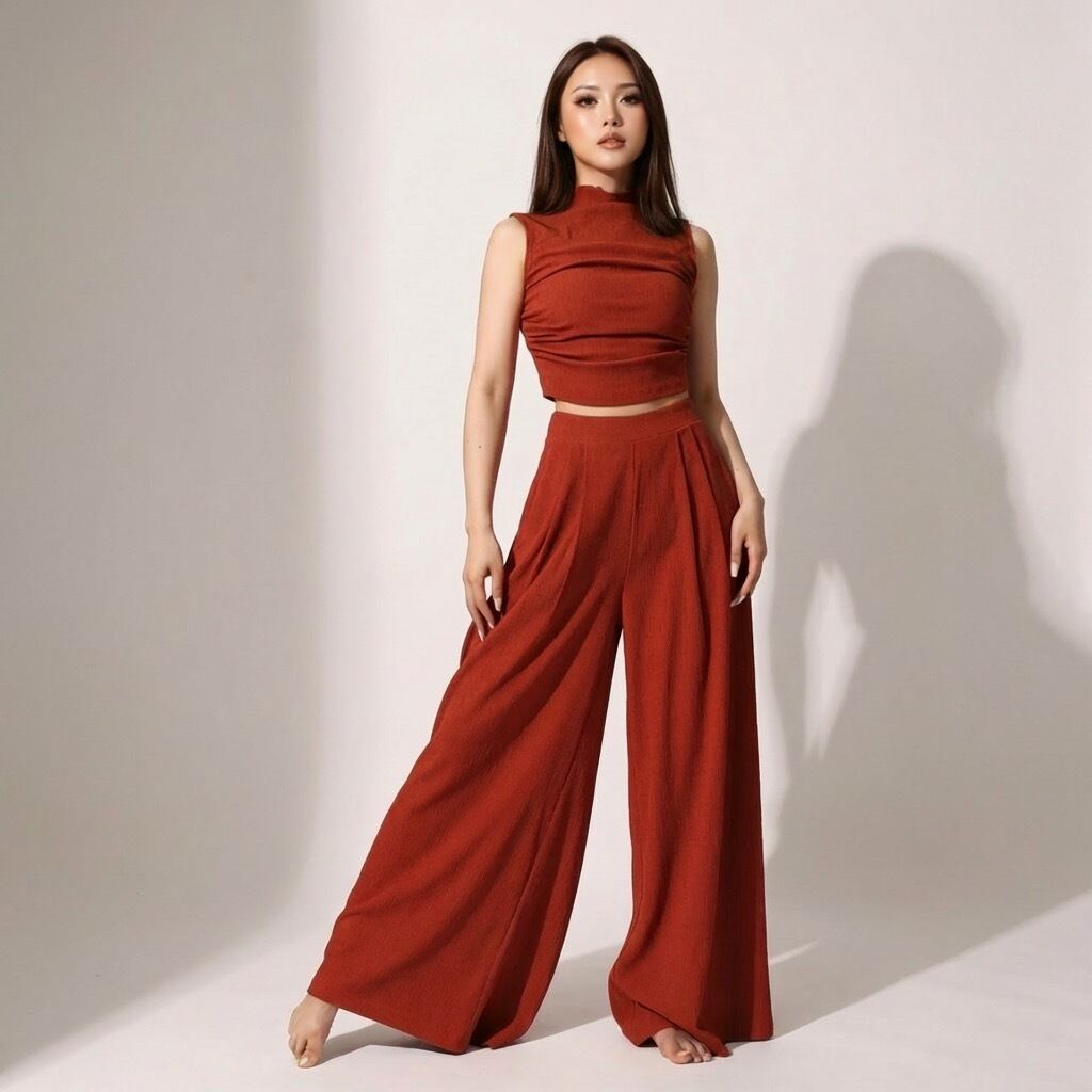 ハイウエストデザインでスタイルアップ効果も期待できるワイドレッグパンツです。