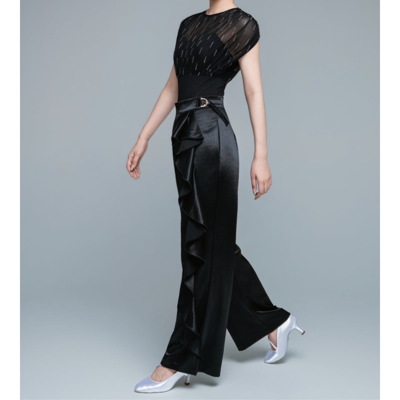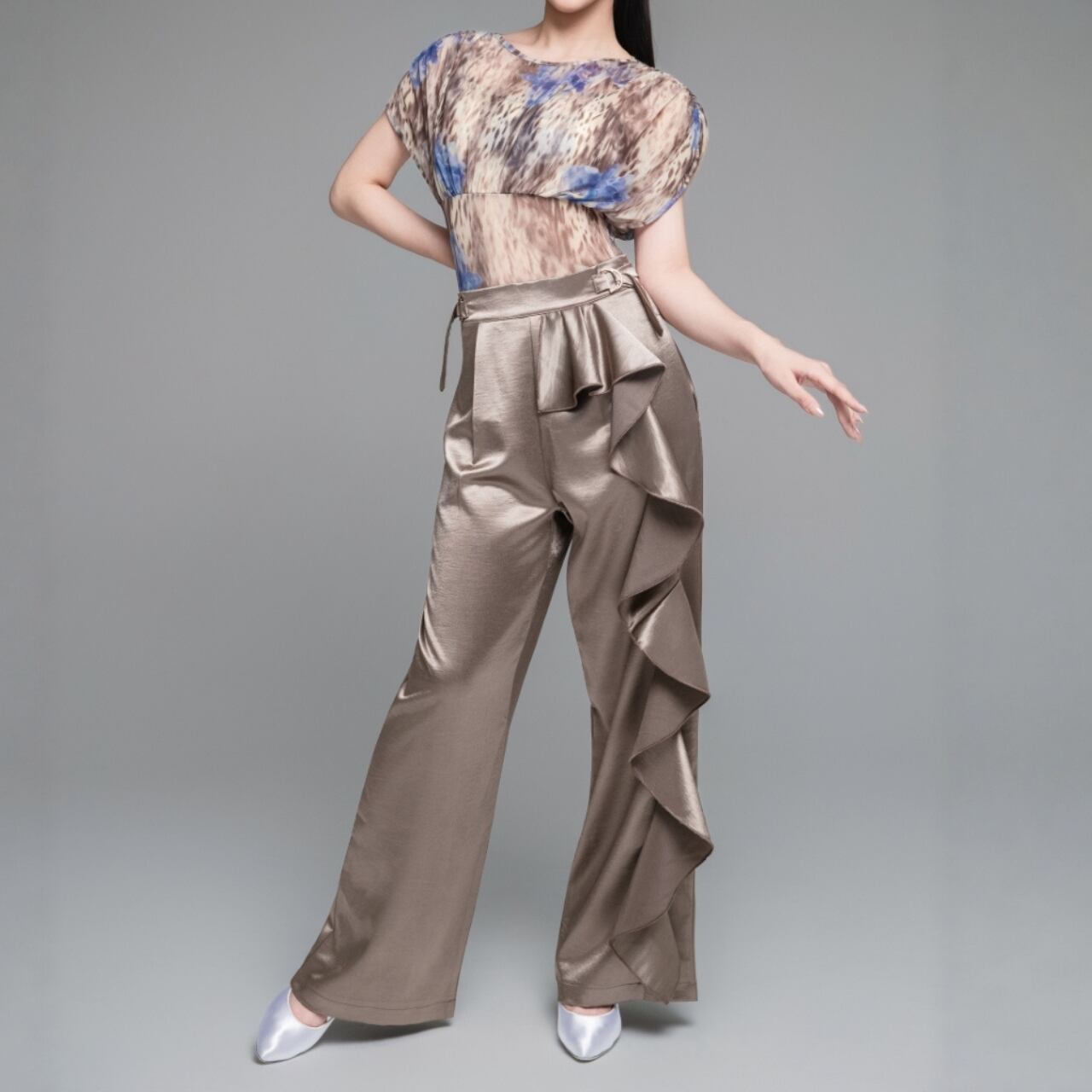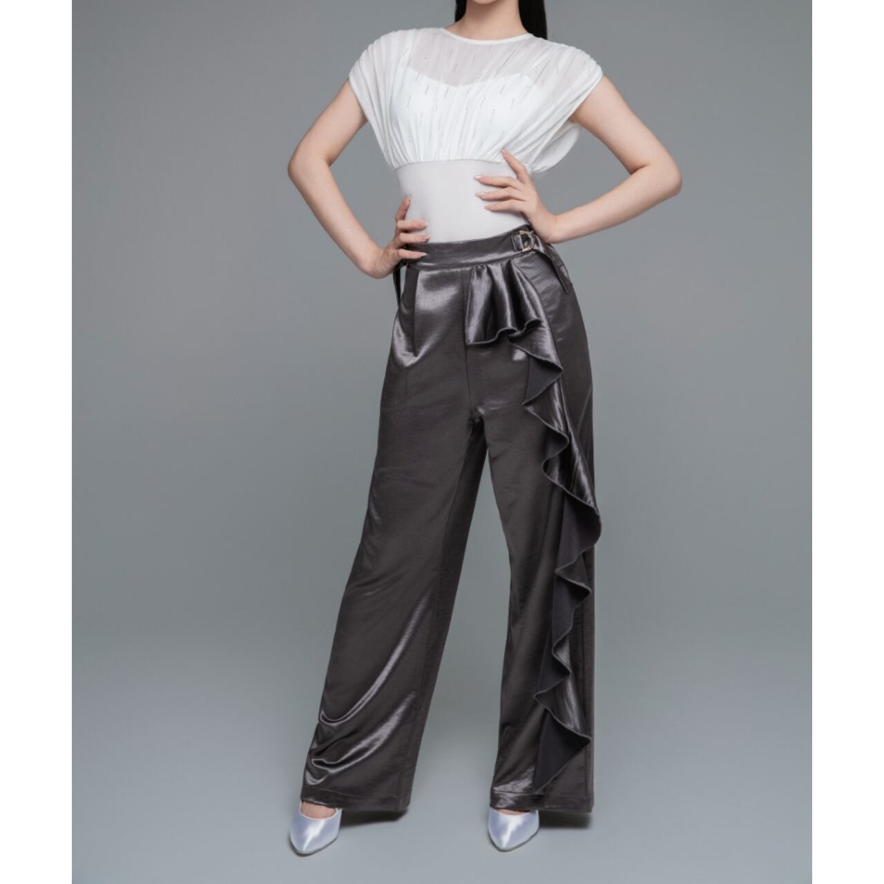 ワイドレッグのシルエットが、優雅でスタイリッシュな印象を与えます。