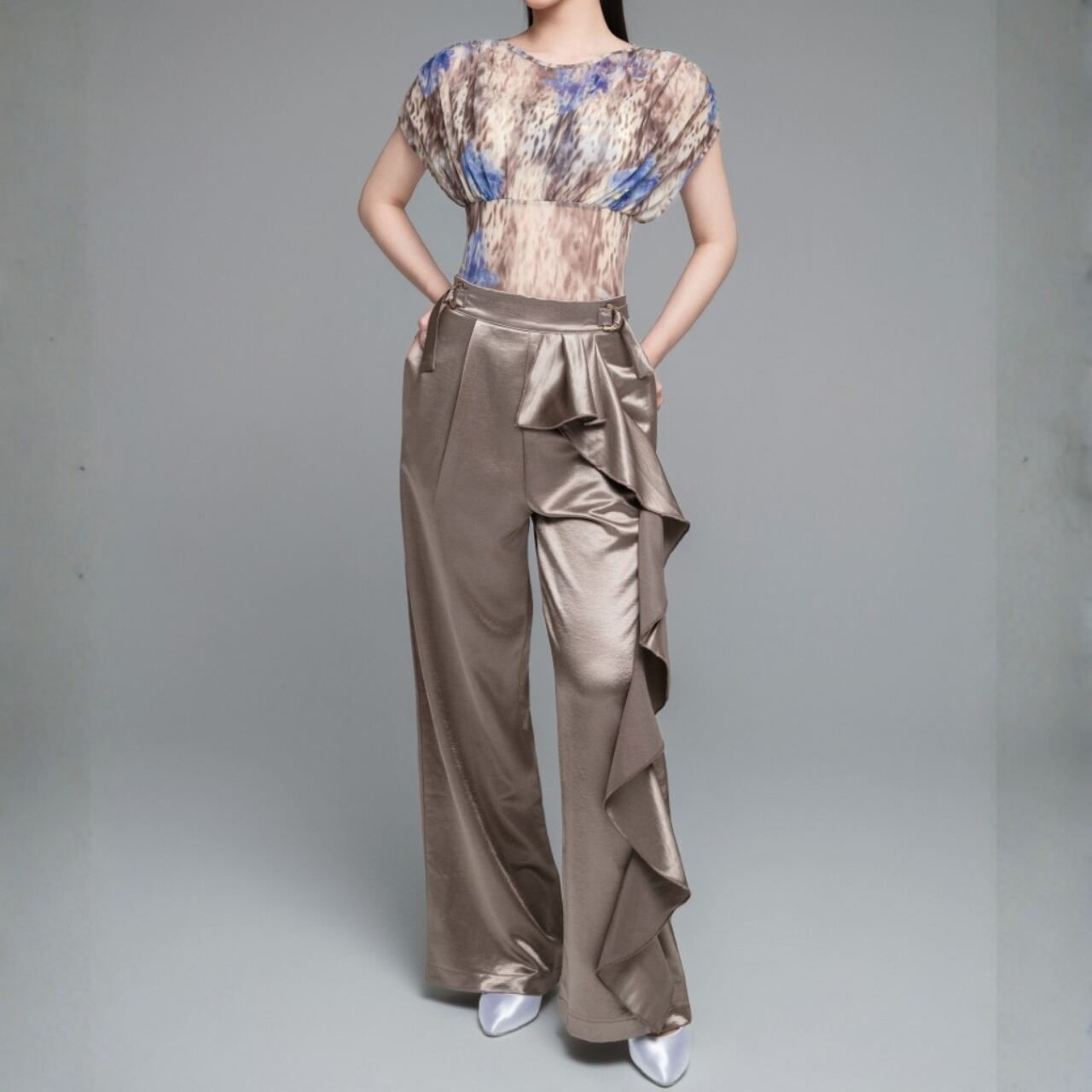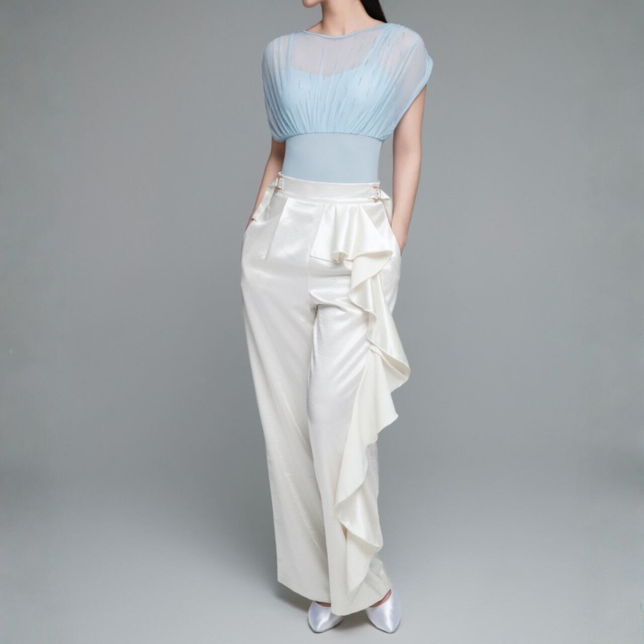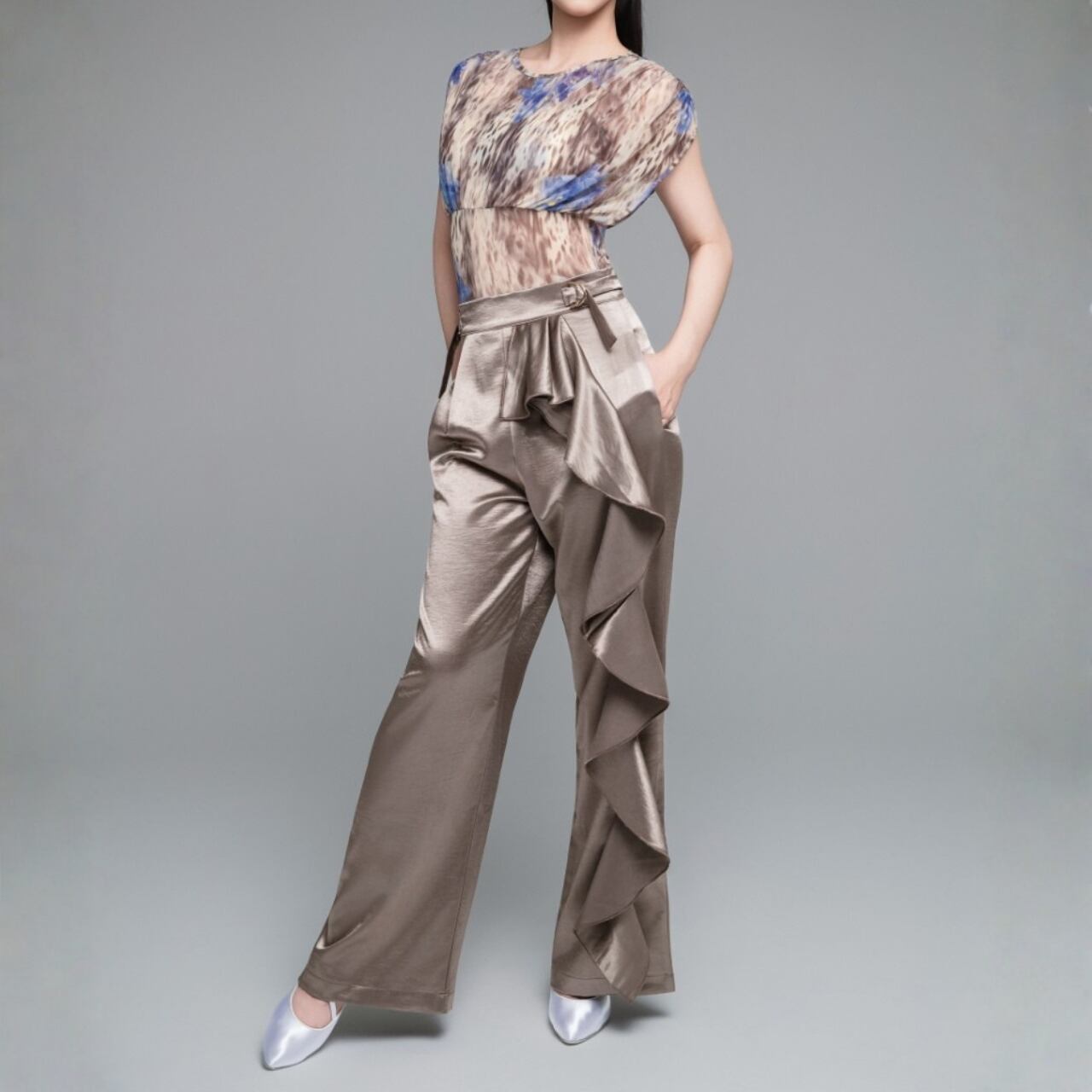 ワイドレッグのシルエットが、優雅でスタイリッシュな印象を与えます。
