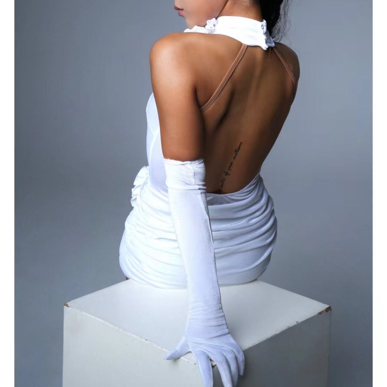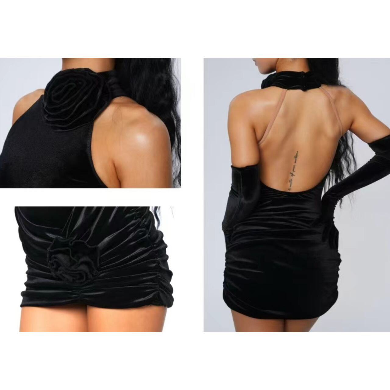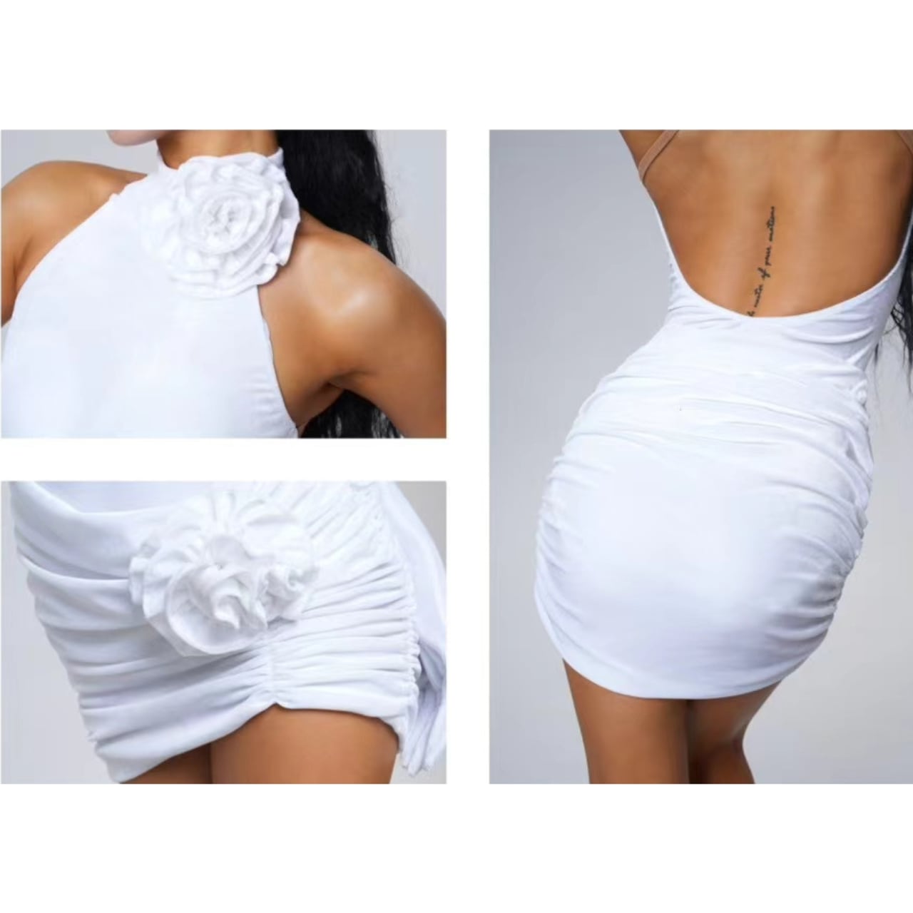 胸元とウエストにあしらったフラワーモチーフが目を引くミニ丈ダンスドレスです。