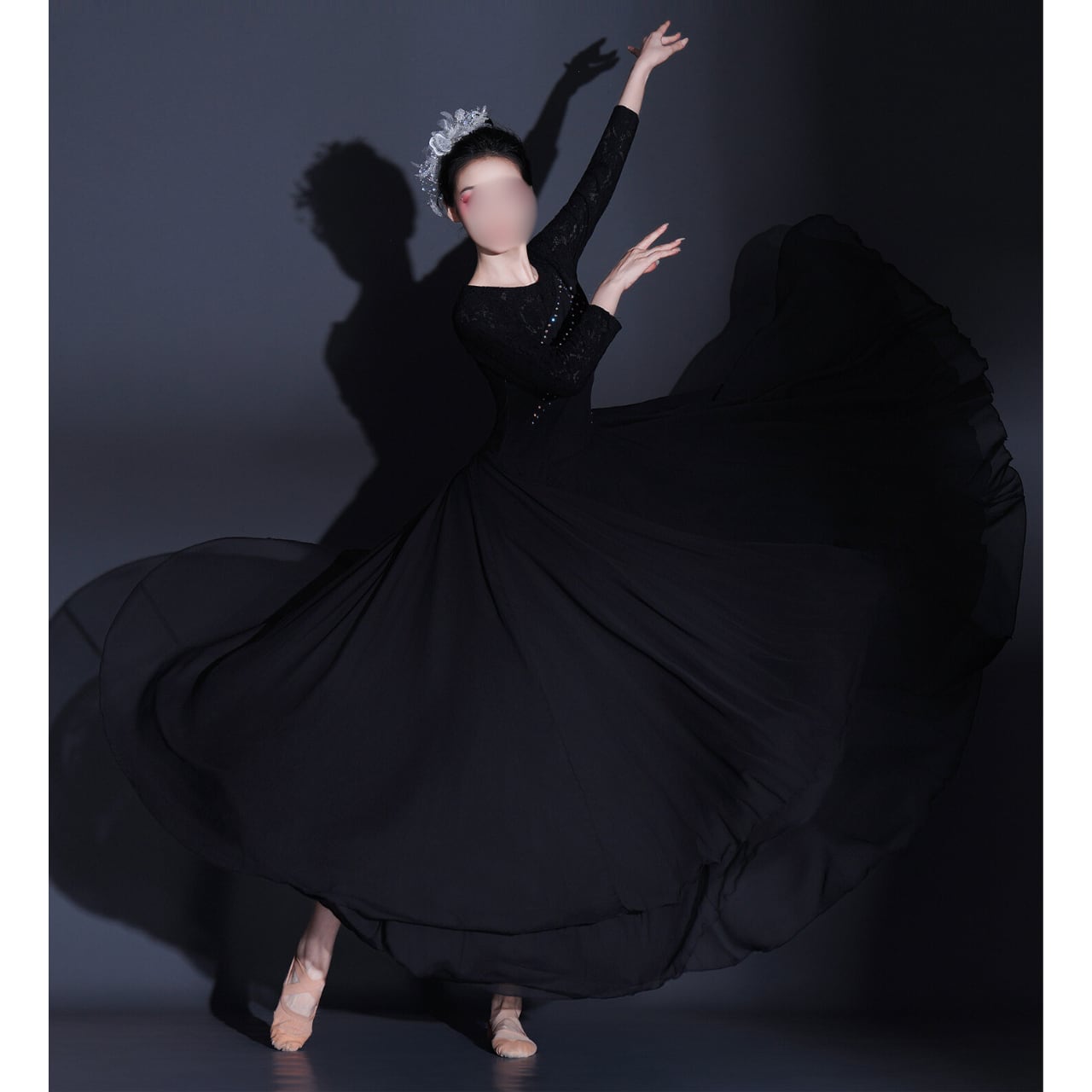 踊るたびに美しく揺れるフレアシルエットが魅力。ロング丈で上品な印象を与えつつ、