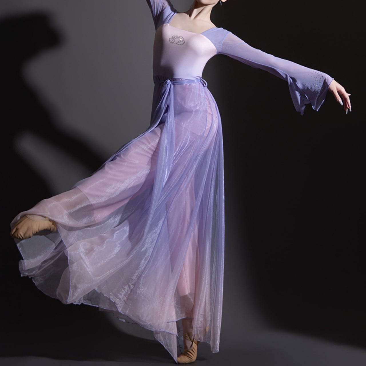 シースルーベルト付きベルスリーブロングダンスドレス S00419