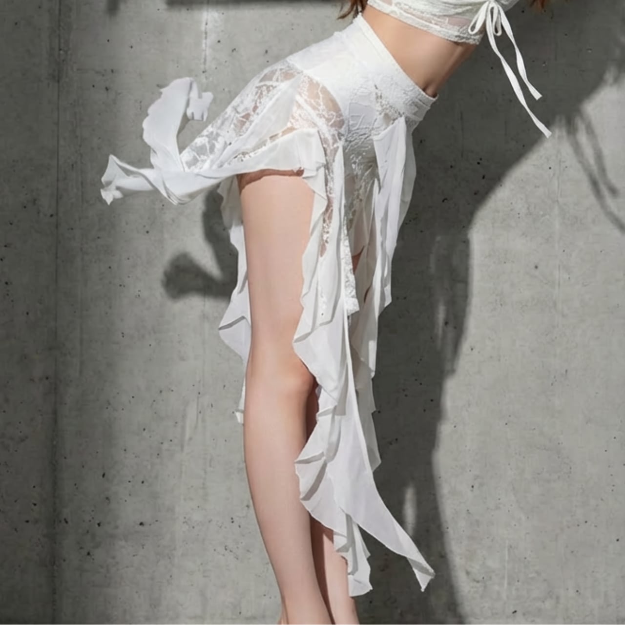 繊細な総レースと軽やかなシフォンフリルが、